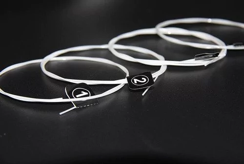 Cuerdas amarradas en 4 círculos colocados en una bolsa de plástico al vacío.
